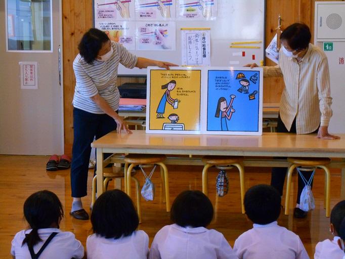 大型絵本・手遊びを入れての朗読等、盛りだくさんの会でした。温かな声かけに、子供達は