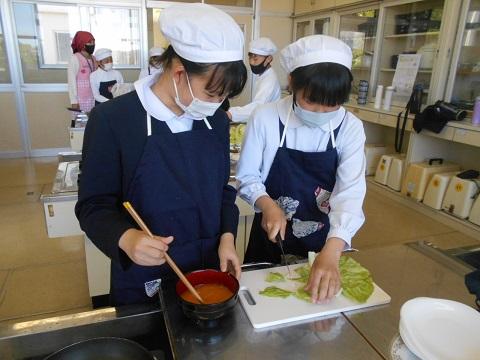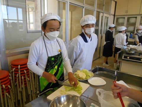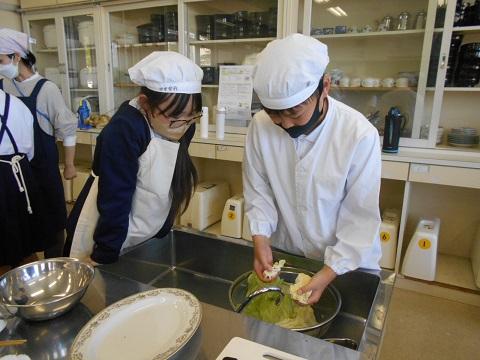 栄養のバランスを考えた「おかず作り」に挑戦しました。包丁を使って、キャベツを食べやすい大きさに切った