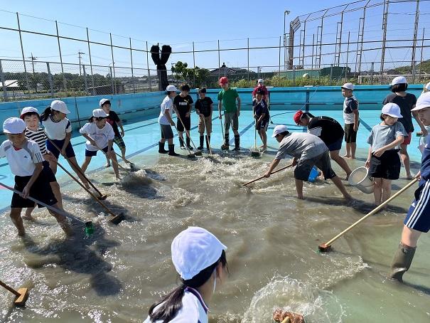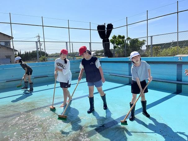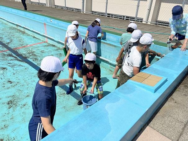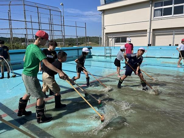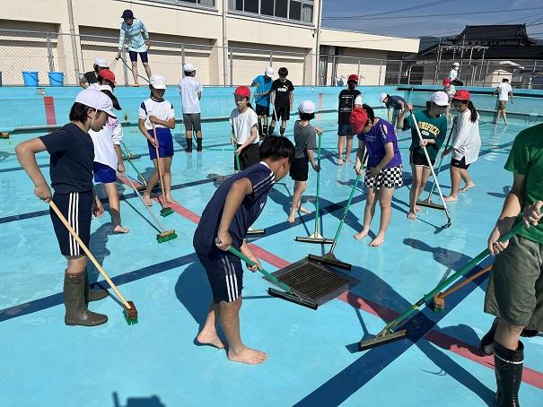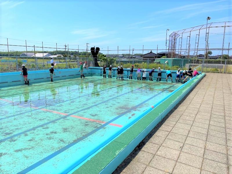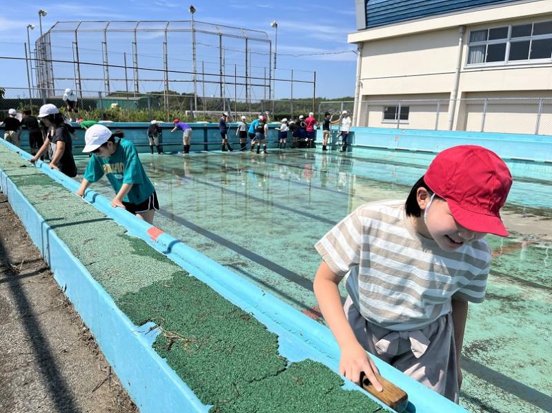 4年生がプールの周りを、そして、5・6年生がプールを掃除してくれました。約1年ぶりのプール掃除ですから、