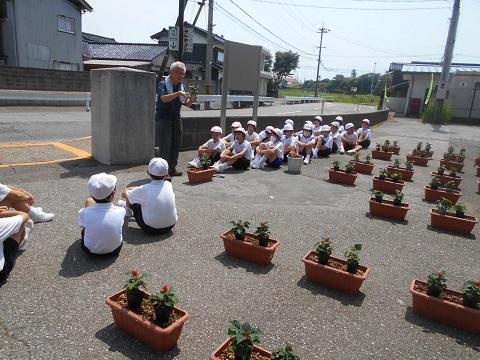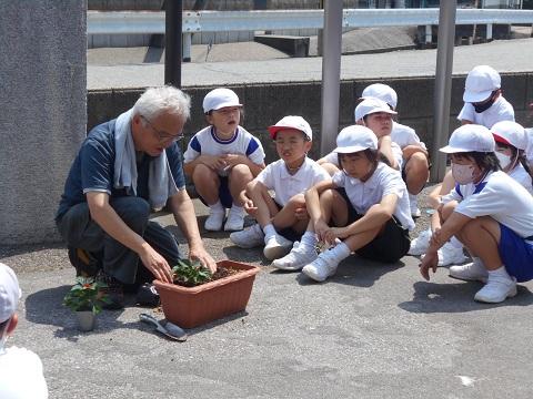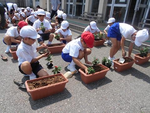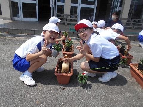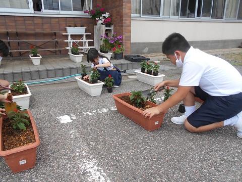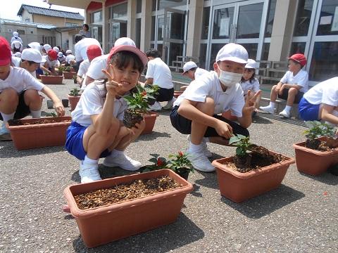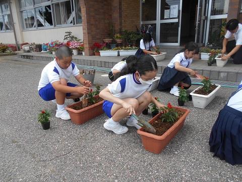 3‣4年生と環境委員が、用務員さんに教えていただきながら、プランターにサルビアの苗を植えました。児童玄関前と職員玄関前にそれぞれ並べ、水やりなどの世話を当番を決め、毎朝続けます。責任と誇りを持って、取り組んでほしいと思います。よろしくお願いします。今後の成長が楽しみですね。