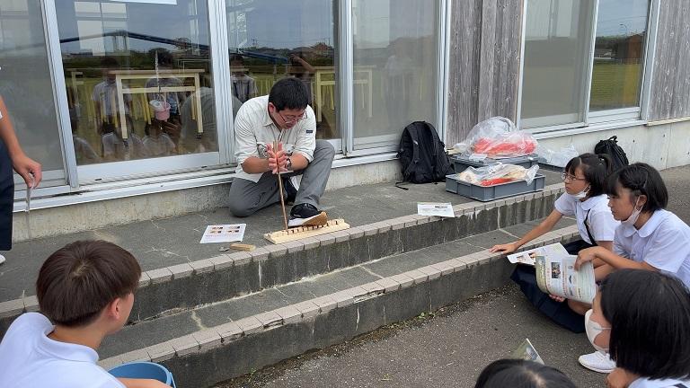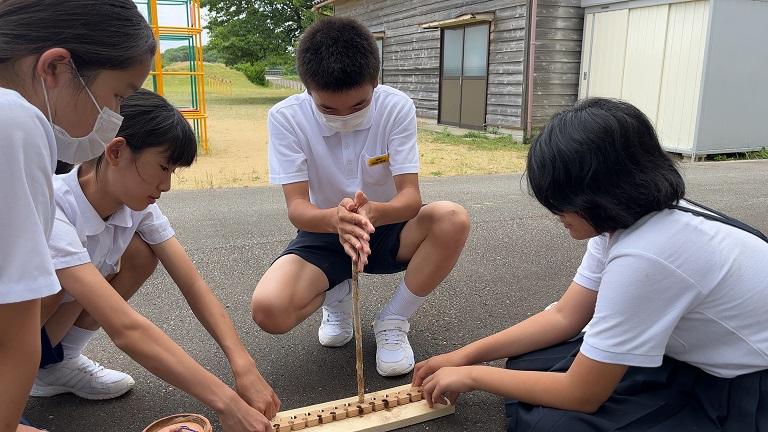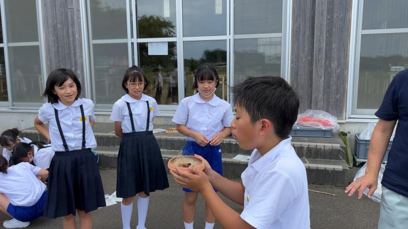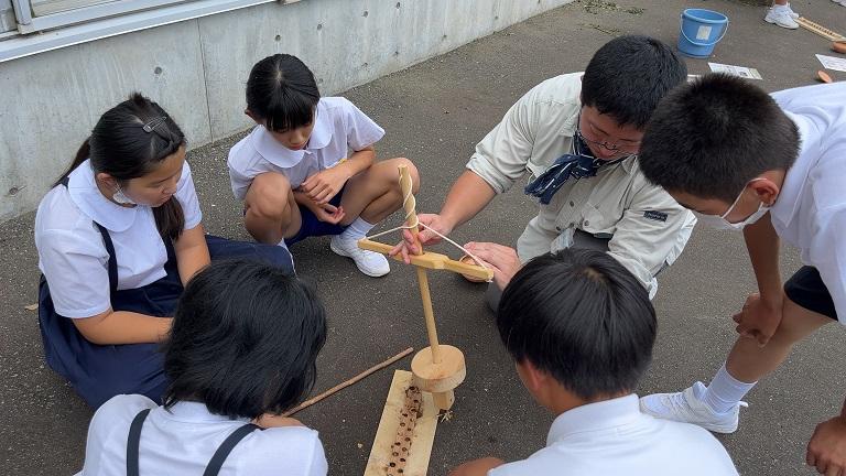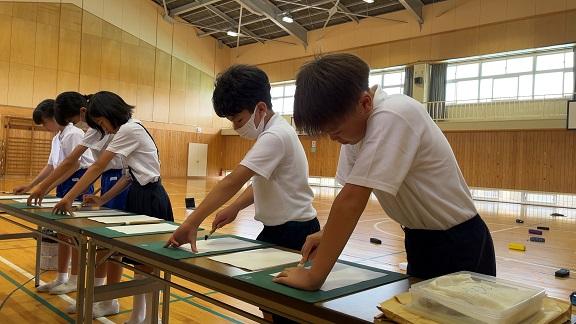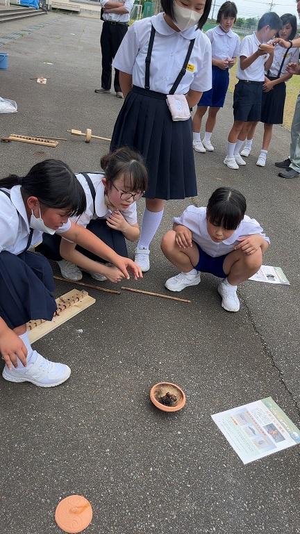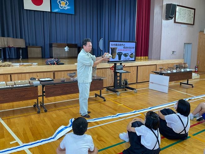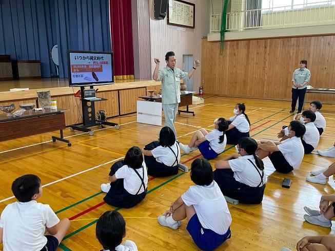 埋文化財センターの方々が来てくださいました。縄文時代のお話を聞いたり、黒曜石の試し切りや火おこし体験をしたりしました。縄文土器や弥生土器、打製石器等、数多くの道具を見ることができ、歴史を身近に感じることができました。体験活動では、石で紙が切れることに驚く姿や、火をつけることに苦労する姿も見られました。昔の道具を体験することによって、現代の便利さを改めて感じることができました。