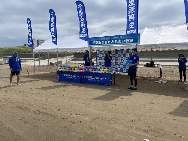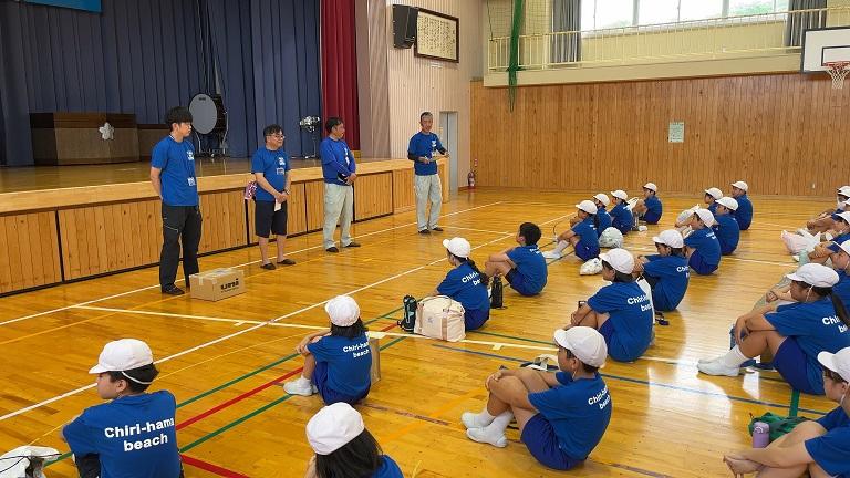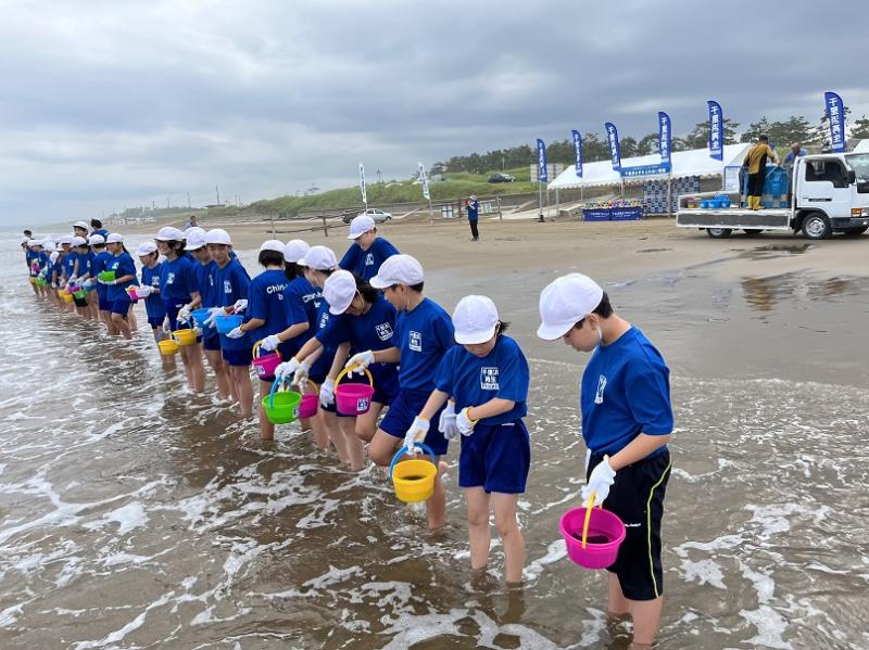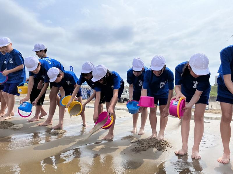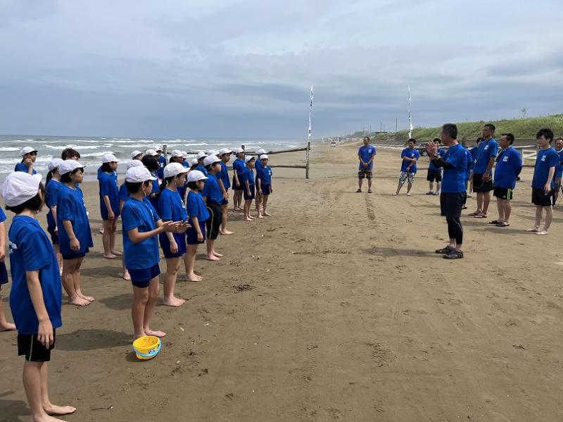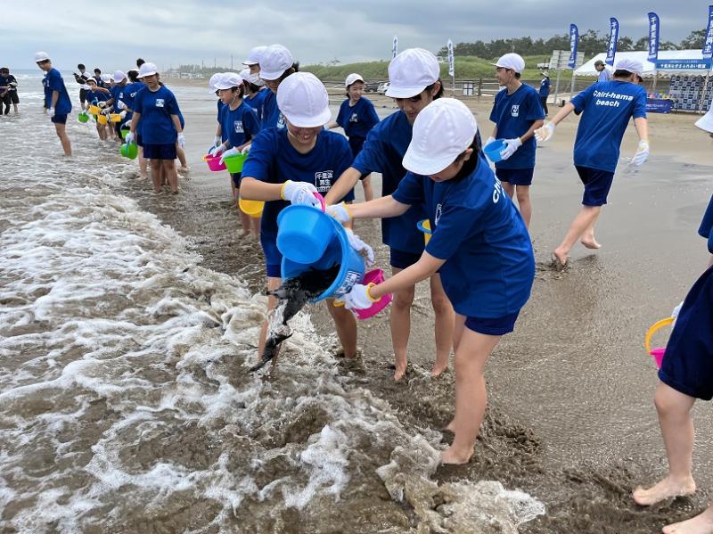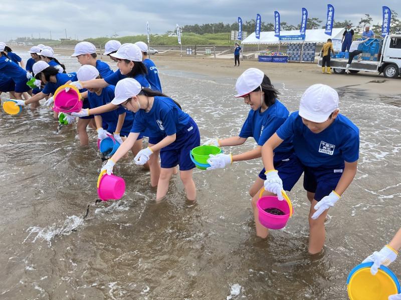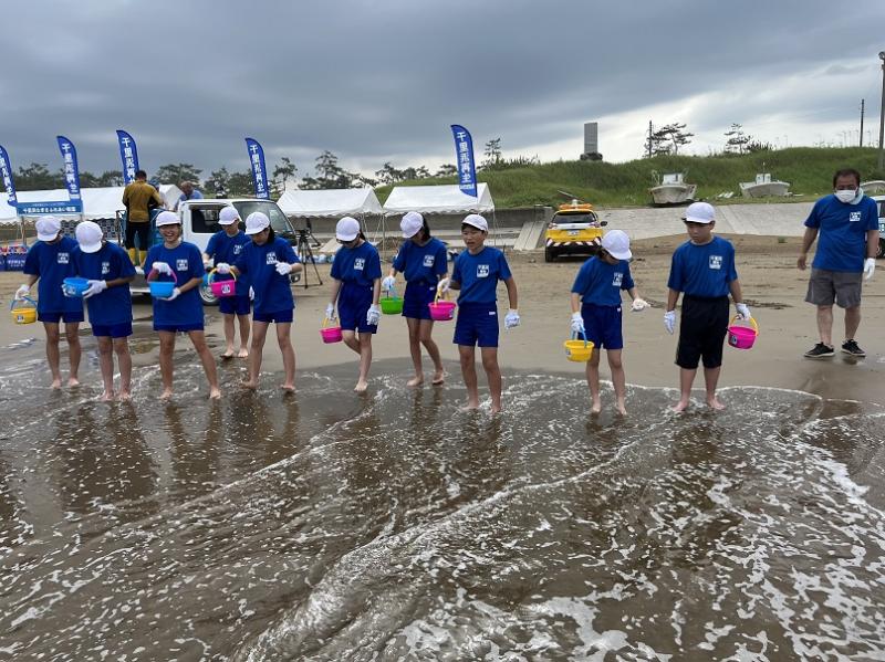 石川県や羽咋市、宝達志水町などでつくる「千里浜再生プロジェクト実行委員会」の方が今浜海岸で「千里浜なぎさふれあい教室を」開き、相見小5.6年生40人が参加しました。そして、ヒラメの稚魚四千匹を放流し、豊かな海を守る気持ちを育みました。はだしで海に入った児童は、体長5センチほどの稚魚を放流しました。その後、砂浜再生を願って海に砂を投げ入れる「一人一砂運動」にも取り組みました。