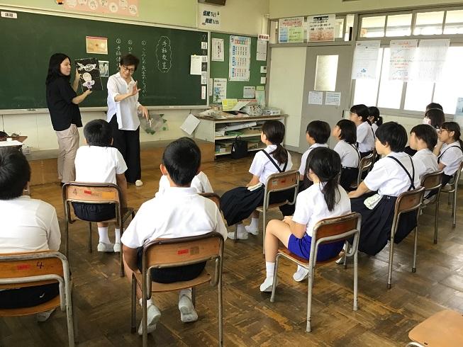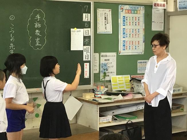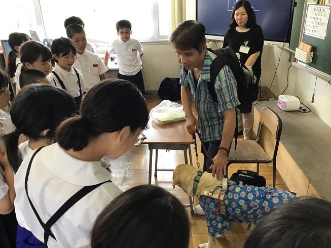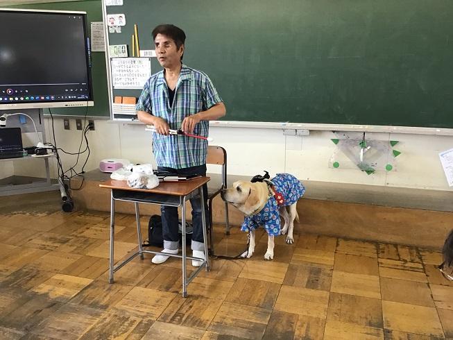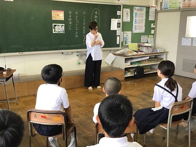 2日間にわたり、宝達志水社会福祉協議会の方の協力を得て、手話と盲導犬について学習する会を持つことが出来ました。これまで、総合的な学習で調べ学習を進め、調べたことをまとめてきましたが、実際に体験することで、より学びが深まりました。盲導犬に関しては、「お仕事中に触れてはいけない」ということを調べていたので、撫でたいと思っていた児童もぐっと我慢していることが伝わりました。また、光で来客を知らせる装置や、カラートーク(色を音声で教えてくれる機械)など、不自由さをカバーする道具も実際に見ることができ、感心している姿もたくさん見られました。