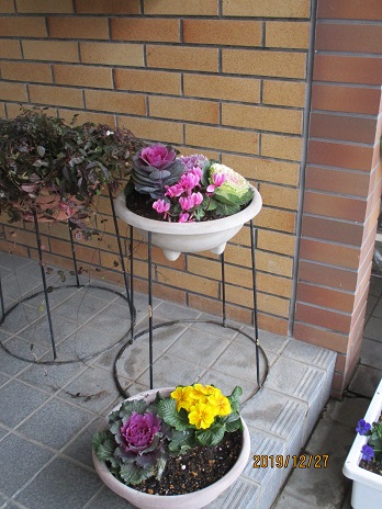 職員玄関には、葉牡丹の植木鉢が並んでいます。