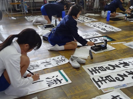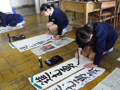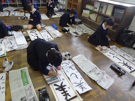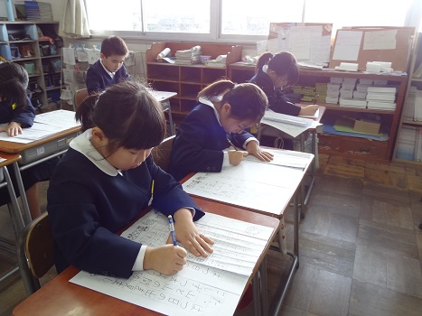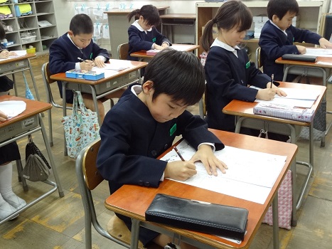 3年生。筆で書く初めての書き初め。手を墨で汚さずに書けるでしょうか・・・