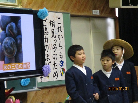 4年生は、地域の偉人。市村栄次郎さん。ブドウ栽培を始めた方についての発表です。