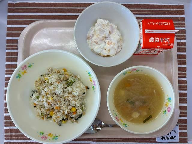 今日は、「ポークペッパーライス」です。豚肉ととうもろこし、ねぎをバターやしょうゆ、オイスターソースで味付けしました。あらびきこしょうも入っています。子どもたちが好きな味付けに仕上がりました。