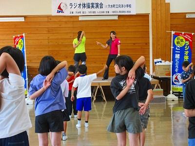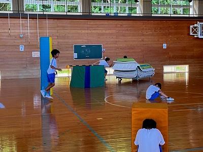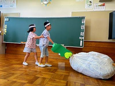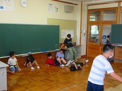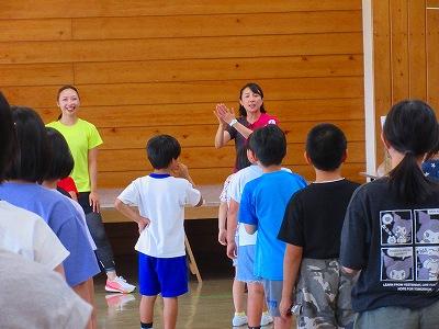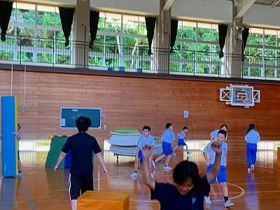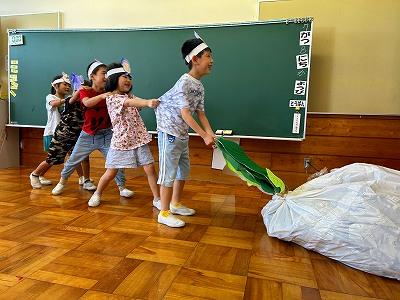 ふれあい集会の第②部は、5・6年生による「短なわとびの跳び方」紹介です。なわとびは1人で手軽にできる全身運動です。ジャンプ力だけでなく、リズム感や手と足の協調性も高まります。すぐにはできなくても、コツコツ練習すると5・6年生達のように上手になります。