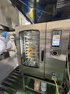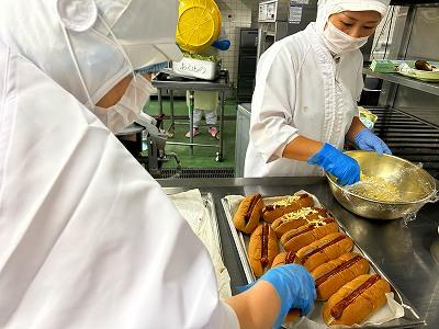 チーズをのせて焼きます。1つ1つ調理員さんの手作業です。調理場の中はパンとチーズのいい香りで充満していました。子どもたちも前の日から楽しみにしていました(^▽^)