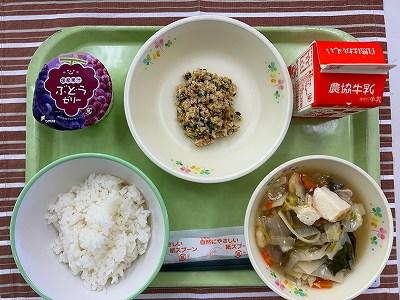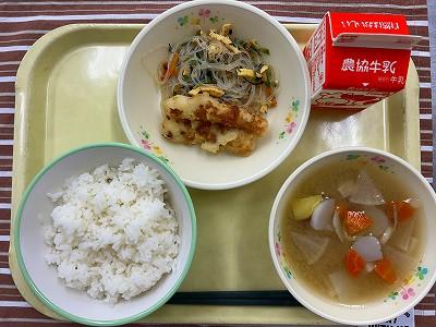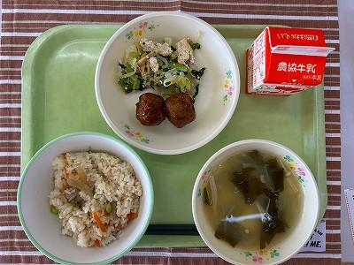 今日の主食は、「五目ごはん」です。外が少し涼しくなり、給食も秋らしいメニューになってきました