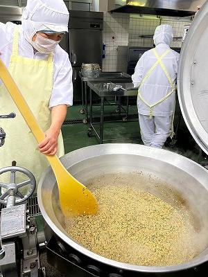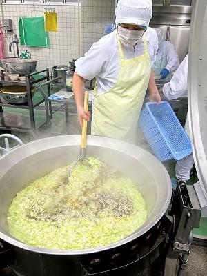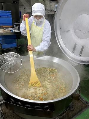 今日はスパゲッティミートソースです。牛肉、豚肉、大豆ミート、玉ねぎ、にんじん、エリンギなどを炒め、トマトケチャップなどを加えて煮込み、ソースを作ります。そこに茹でたスパゲッティを加えます。量が多いので、おじゃじ作業を2釜にわけて行います。熱くて大変な作業ですが、たっぷりのスパゲッティがおいしく仕上がりました(^▽^)