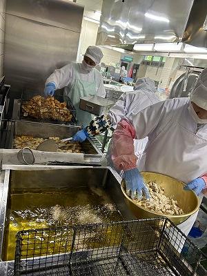 今日の主菜は、「ちくわのチーズあげ」です。小麦粉と米粉で作った衣に粉チーズをいれ、ちくわにつけて揚げます。チーズの風味が食欲をそそります。子どもたちにも人気がありました。