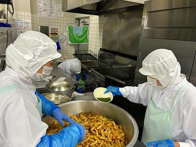 今日は珍しく「フライドポテト」を提供しました。カリっと揚がったポテトに塩とパセリを合わせてからめます。量が多いので、ポテトが崩れないように注意しながら作業してくれました(^▽^)
