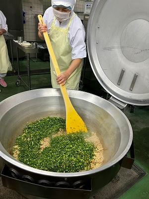 今日は初メニューの「スタミナ納豆」を提供しました。にんにくとしょうがを炒め、鶏ひき肉を加え、そぼろを作ります。そこに青ネギと納豆を加え混ぜ合わせます。パンチのある、ごはんによく合う味に仕上がりました。