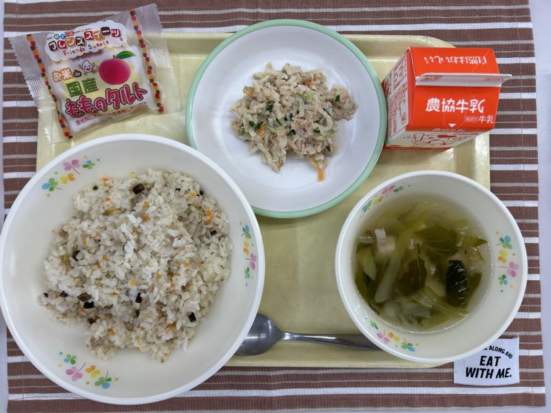 わかめごはん、炒り鶏、いわしの唐揚げ、チーズ入りお浸し、牛乳
