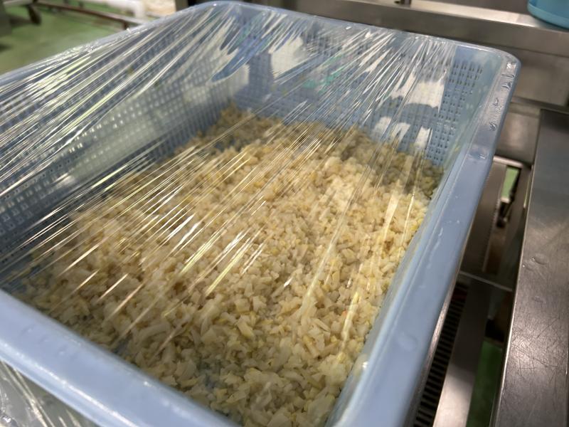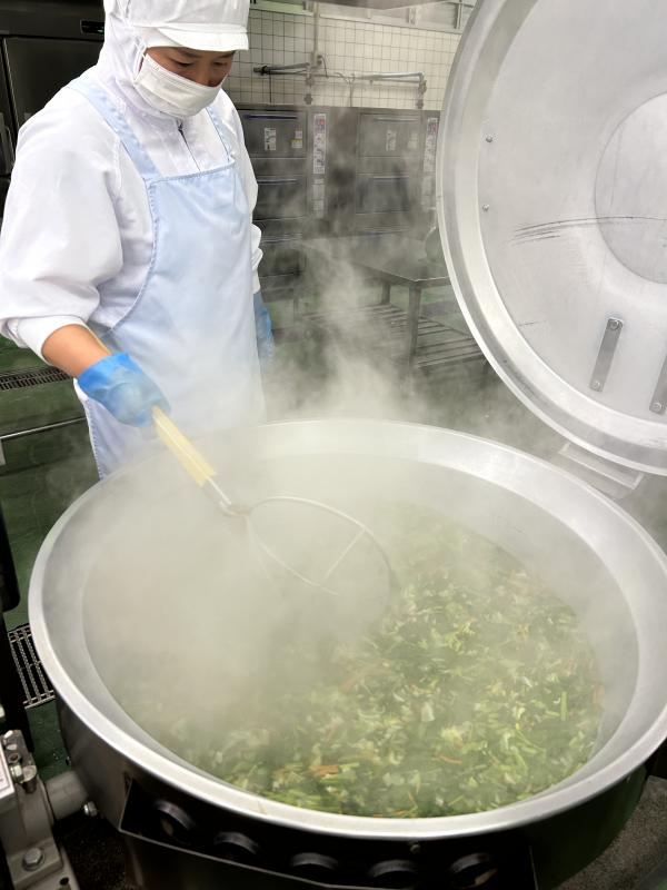 今日のあえものは、塩こんぶあえです。穴水の給食施設には真空冷却機がないため、調理員さんたちは
