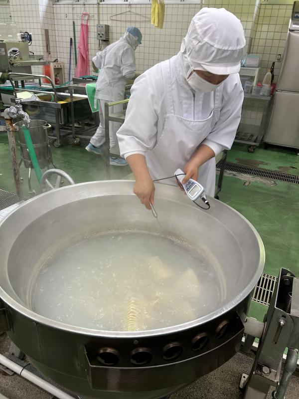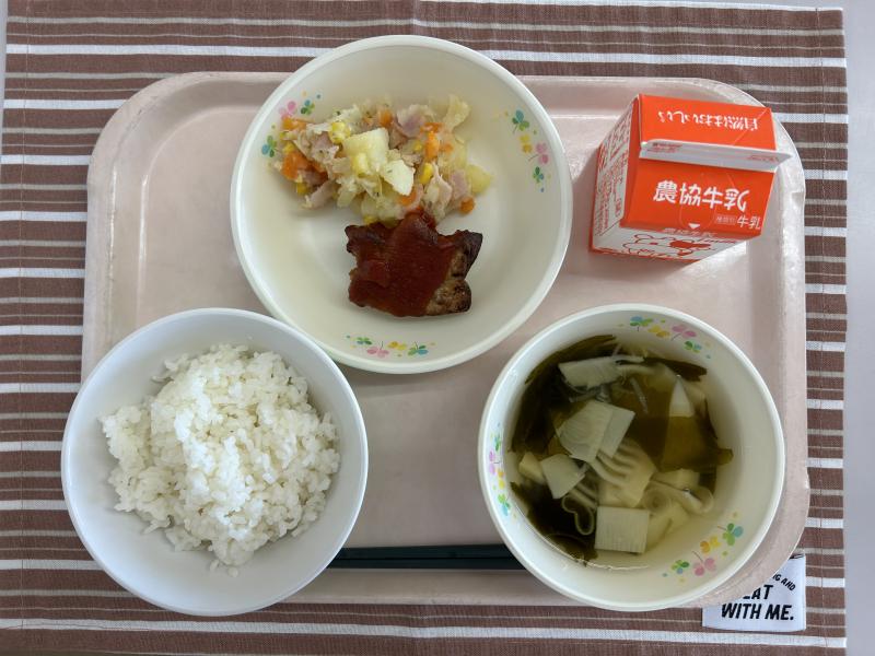 汁物は若竹汁です。皮をむいたたけのこを、米のとぎ汁で炊き、あく抜きをします。ごはんを自校で炊いている学校ならではですね!