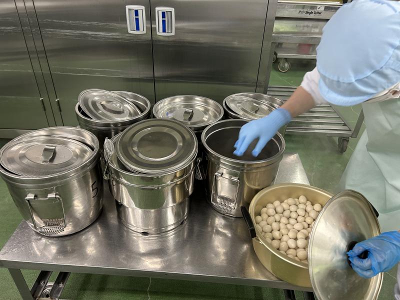 みそおでんのうずらは、あたる個数が偏らないように、調理員さんが数を数えて入れてくれています。味がしみ込むように、別の鍋で味付けしています。今日は少し寒かったので、あたたかいみそおでんがおいしかったです。