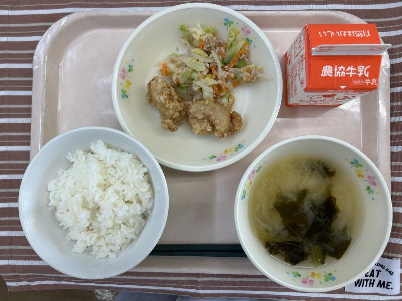 ごはん、鶏の磯辺揚げ、ゆかり和え、もずくスープ、牛乳