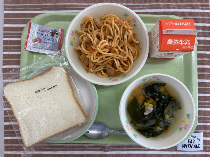 食パン、夏野菜のミートソーススパゲティ―、コンソメスープ、牛乳