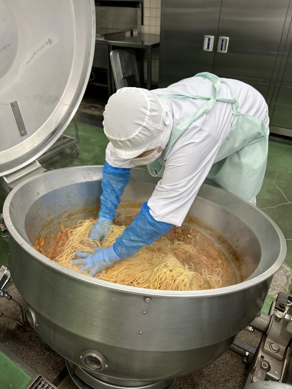 給食のナポリタンスパゲティは、まず大きな釜で、野菜やウインナー、トマトケチャップなどを炒めソースを作ります。その後、少し固めにゆでたスパゲティを加えて混ぜ合わせて作っています。出来立てのスパゲティはとても熱いので、調理員さんは、手際よく混ぜて仕上げてくれました!