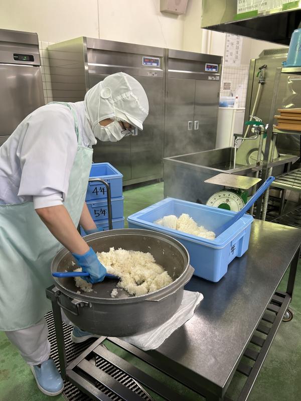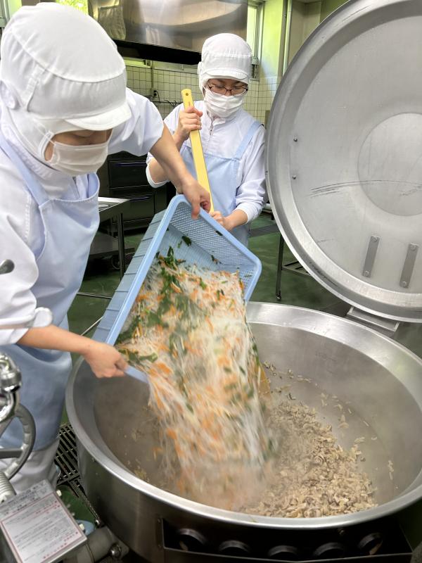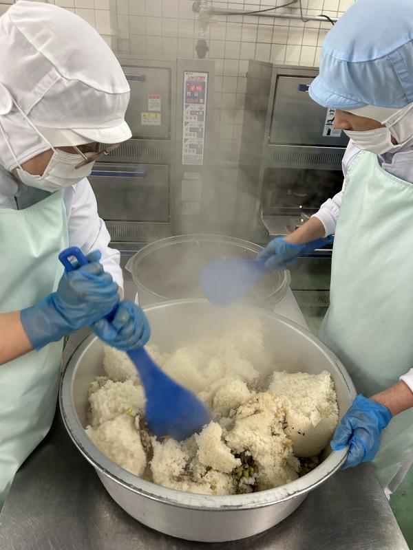 今日の給食はひじきごはんでした。しょうゆと酒をこんぶを入れて炊いたごはんに、別の炊いた具を混ぜ込んで作ります。優しい味つけの具がたっぷりの混ぜごはんに仕上がりました。