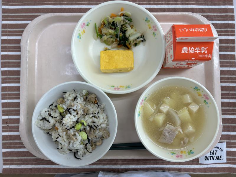 五目ごはん、ピリ辛豚汁、卵と野菜の和え物、牛乳