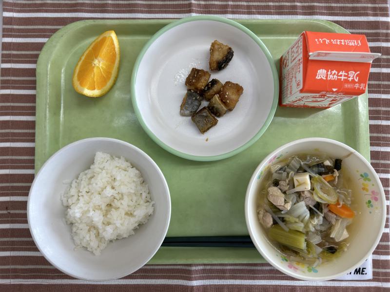 ごはん、サバの南蛮漬け、切干大根のピリ辛炒め、めった汁、牛乳