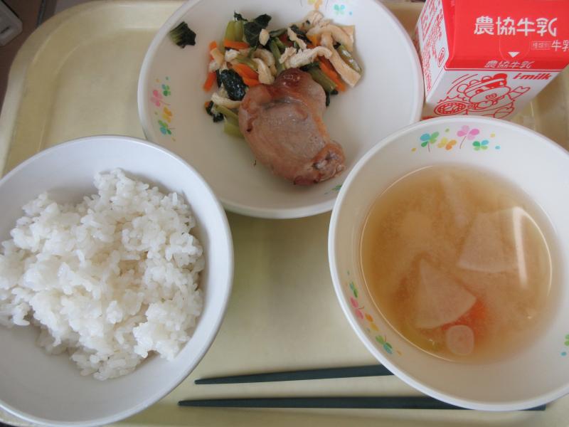 ごはん、鶏肉のごまみそ焼き、磯辺和え、さつま汁、牛乳