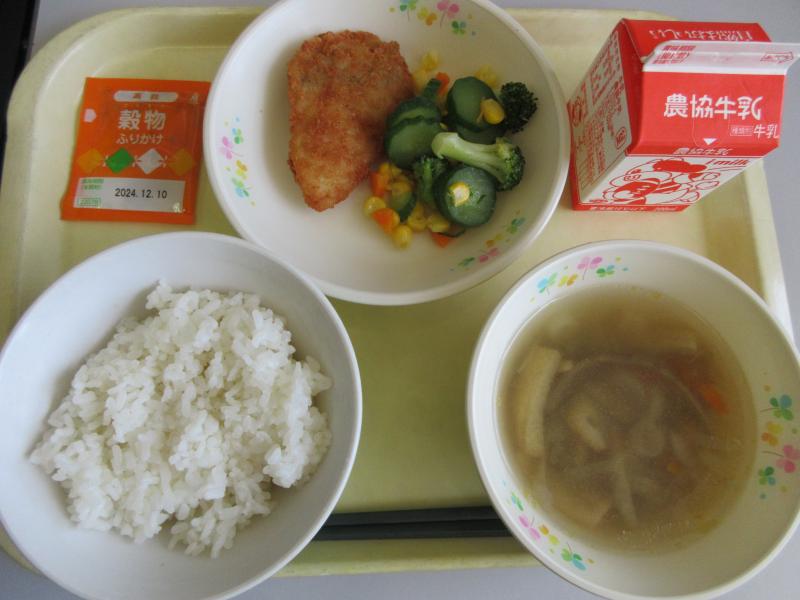 ごはん(ひゃくまん穀)、豆腐スープ、ちくわのチーズ揚げ、切干大根のピリ辛炒め、牛乳