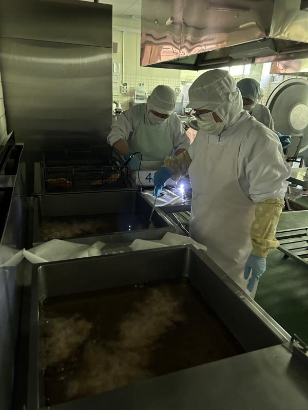 今日は午前中にまさかの停電!ごはんは炊けていて蒸らし段階だったためギリギリセーフでした。あげものやサラダ、汁物は電気のつかない調理場でなんとか作業し、無事仕上げることができました。