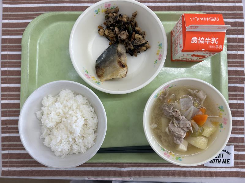 ごはん、サバのしょうが煮、ひじきの炒り煮、鶏とごぼうのすまし汁、牛乳