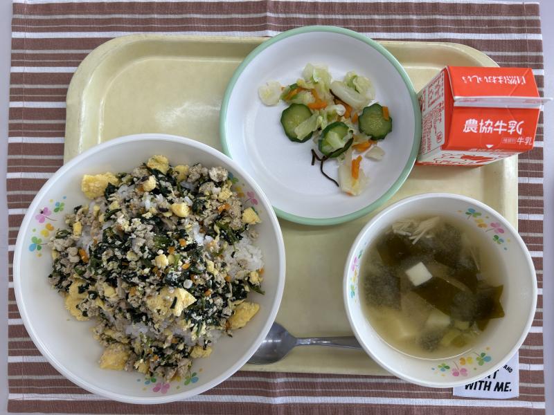 豚肉のピリ辛丼、わかめスープ、きゅうりのピリから和え、牛乳