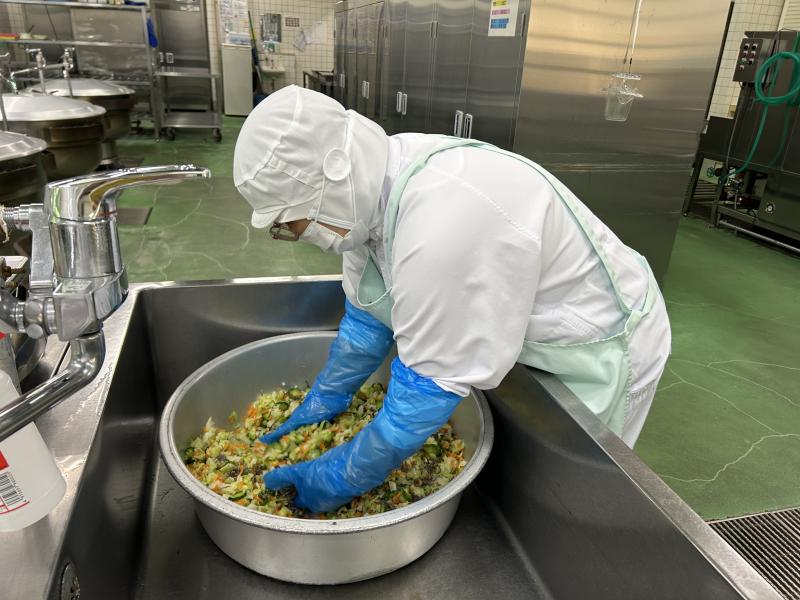しっかり水でゆでた野菜を冷まし、和える直前まで冷凍庫に入れ冷やします。和える前に、もう一度水気を水気を切り、調味します。専用のエプロンと手袋をつけ、温度の記録もします。