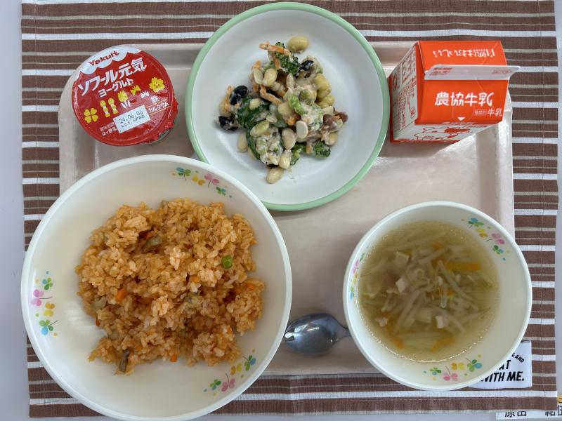 ミックスピラフ、卵スープ、ツナサラダ、牛乳