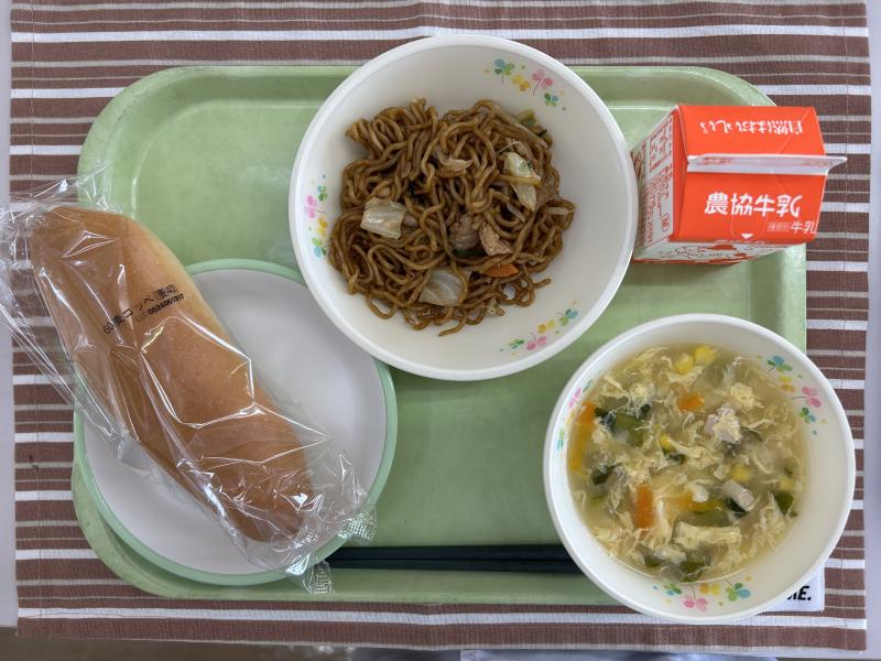 こっぺぱん、ジャージャーうどん、麹のスープ、牛乳