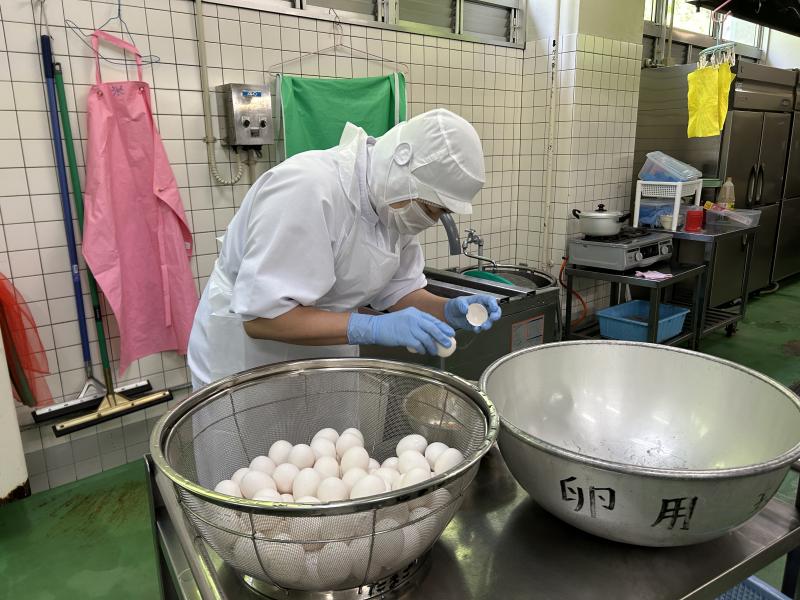 給食では、穴水町でとれた卵を使用しています。1個1個調理員さんが血や殻が入らないように確認しながら割っています。スープに入れるときには、とろみをつけてから卵を入れるとふわふわに仕上がります。写真はザルでこしながら入れている様子です。こうすることで異物混入を防ぐことができます。