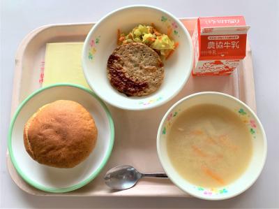 セルフハンバーガー(ハンバーグ・カレーソテー・スライスチーズ)、コーンスープ、牛乳