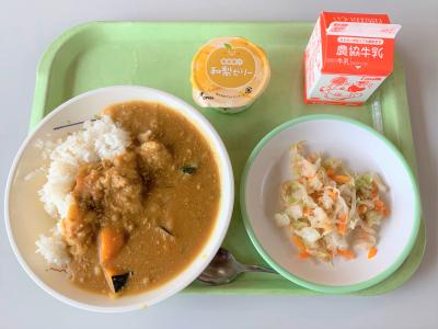 夏野菜カレー、ツナサラダ、和梨ゼリー、牛乳