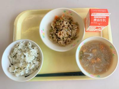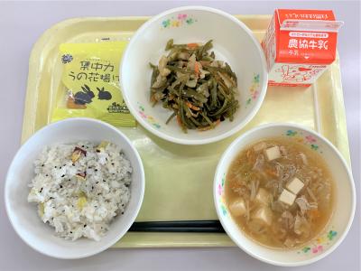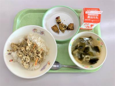 わかめごはん、大根のそぼろ煮、五目きんぴら、牛乳