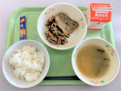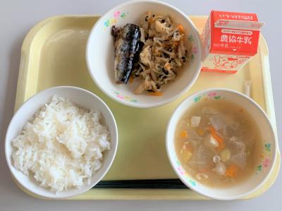 ごはん、サバの生姜煮、切干大根のはりはり漬け、みそけんちん汁、牛乳