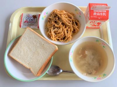 食パン、ミートソーススパゲティ、コーンスープ、黒ごまクリーム、牛乳