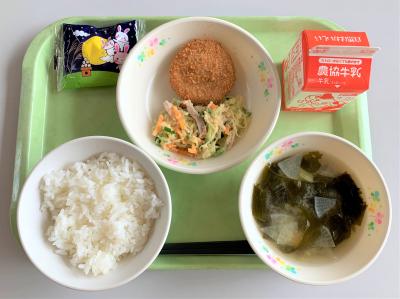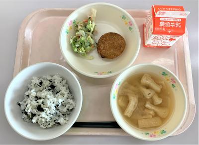 わかめごはん、メンチカツ、ブロッコリーのごまマヨ、みそ汁、牛乳