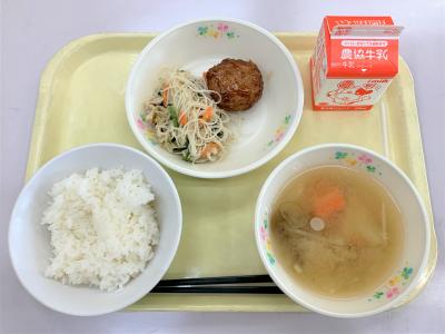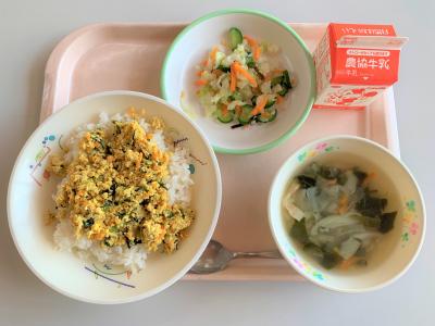 ごはん、豆腐ナゲット、切干大根の酢の物、卵とじ、ヨーグルト、牛乳