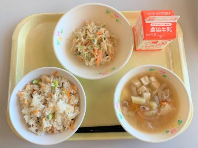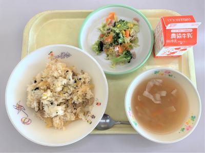 五目ごはん、ピリ辛豚汁、かみかみサラダ、牛乳
