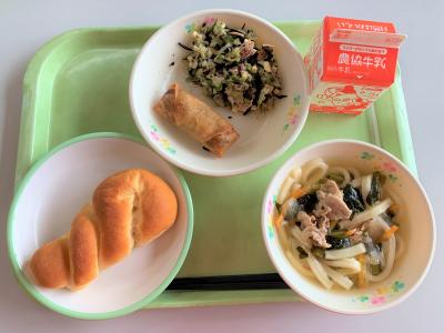 米粉パン、春巻き、ひじきサラダ、肉うどん、牛乳