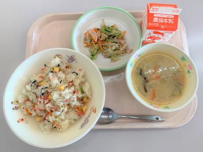 ジャンバラヤ、コンソメスープ、青のりポテト、牛乳
