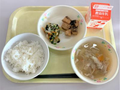 ごはん(ひゃくまん穀)、いわしのみぞれ煮、切干大根の煮物、のっぺい汁、牛乳