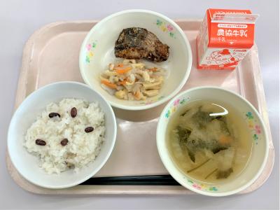 小豆ごはん、ブリのいしる風味揚げ、五目なます、みそ汁、牛乳