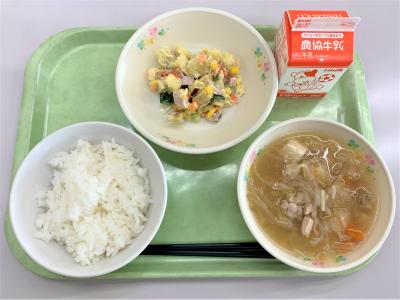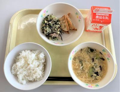 ごはん、揚げギョウザ、ひじきサラダ、中華風コーンスープ、牛乳
